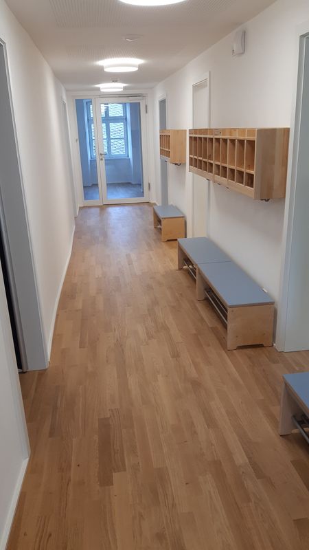 Das unter Denkmalschutz stehende ehemalige Pfarrhaus wurde komplett entkernt. Auf drei Etagen wurden zwei Gruppenräume geschaffen, und im Dachgeschoss entstand ein Bewegungsraum. Im Erdgeschoss wurde eine Gewerbeküche für 100 Essen täglich installiert. Alle haustechnischen Anlagen wurden erneuert, einschließlich einer Zu- und Abluftanlage mit Wärmerückgewinnung sowie einer Luft/Wasser-Wärmepumpe mit Fußbodenheizung zur Wärmeversorgung. Das Projekt wurde 2020 erfolgreich abgeschlossen.