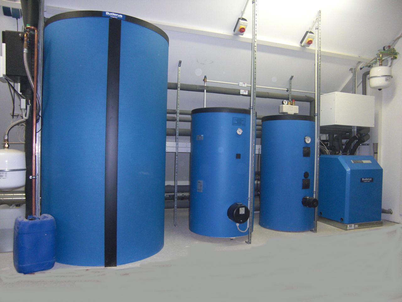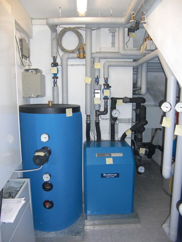 Die Heizungsanlage besteht aus einem Öl-Brennwertkessel und einem Festbrennstoffkessel. Im Sanitärbereich wurde eine Frischwarmwasserstation installiert.